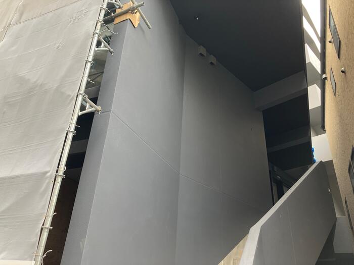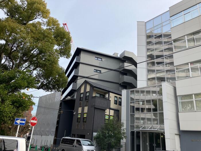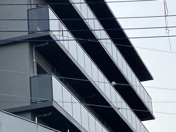現場のカバー3-6階部分が取れ、黒ガラスのベランダが見えました!!カッコいいとNAGOMIカフェのオーナーにも言って頂けました!