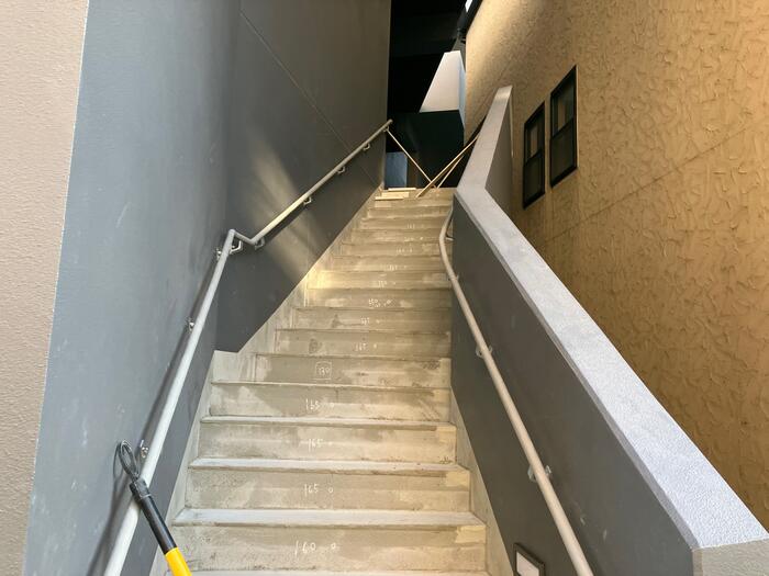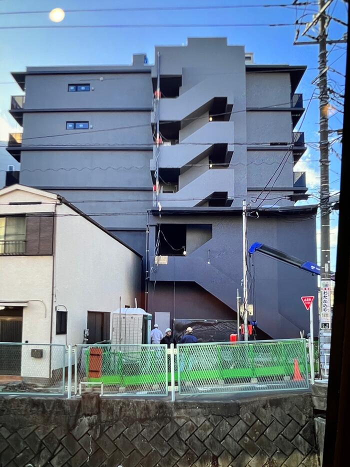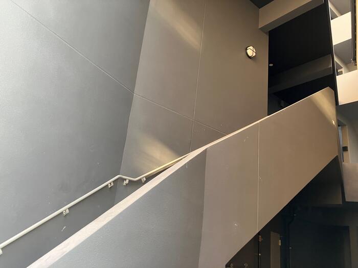 階段は右斜に角度があり美しいです! 色も特殊なグレーでデザイナーズマンションのこだわりを感じさせます。 リバーサイド側の外階段もビックカメラ側、ファミリーマート側から近づいた時に、グッと美しい見たことがない形状に、こだわりのデザイン性を感じます。施工もすごく大変だった事が想像できます。色もヨーロッパ風で美しいです。
