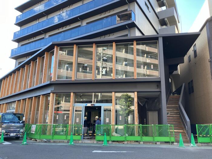 外観はグレー系に統一されつつ、国産杉を大きく使い、エントランス、内廊下にも木を使った統一感があります。1、2階の商業エリアの面積は広く、3、4、5階の居住スペースは道路面より下げるなど空間感覚を高める工夫に満ちているため、遠くから見ても、近くで見ても空間感覚が高まっている事が実感できます。
