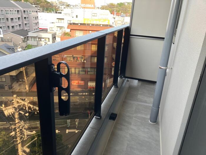 ベランダの見どころとしては、黒いガラスのベランダである部分です。高級感があるだけでなく、視界を遮りつつ、部屋からは見通せる透け感。部屋干しが当たり前になった今、最先端のベランダデザインとも言えると思います。通常は、コンクリート作りでや乳白色で閉鎖感があります。