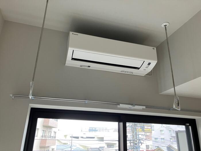 部屋には、エアコンの前に物干し竿をさせる棒がセットされています。湿らせたタオルをかけておけば、部屋の湿度を保つのにも役立ちます。
