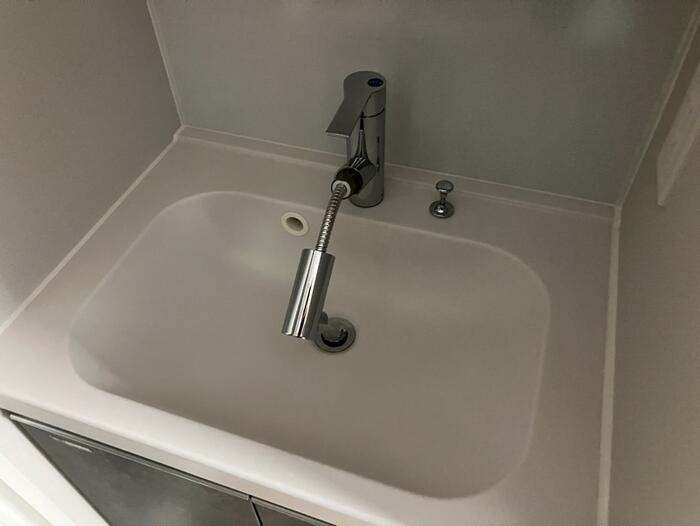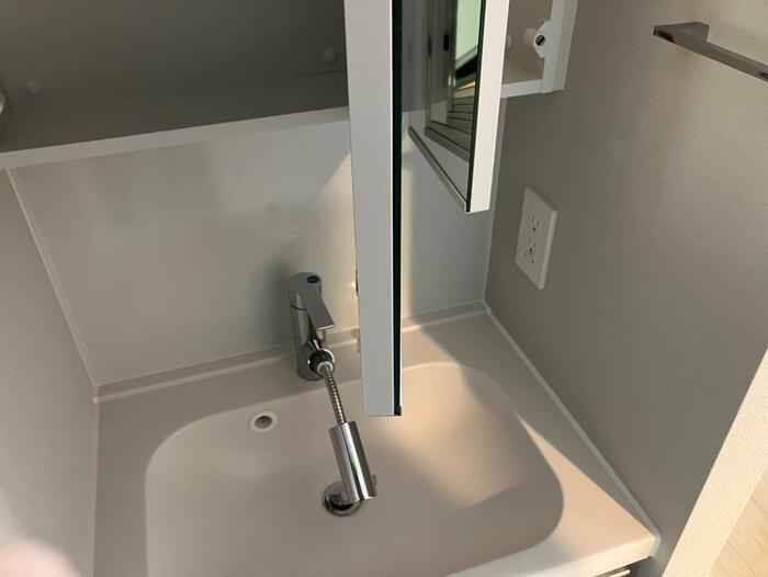次は、嬉しい独立洗面台。お湯を使って、水道のノズルを伸ばして朝シャンができます。鏡も上下に広めめなのでドライヤーを使って、出かける前の身だしなみもしやすいです。鏡の裏には収納スペースもあるので洗面周りもスッキリできます。