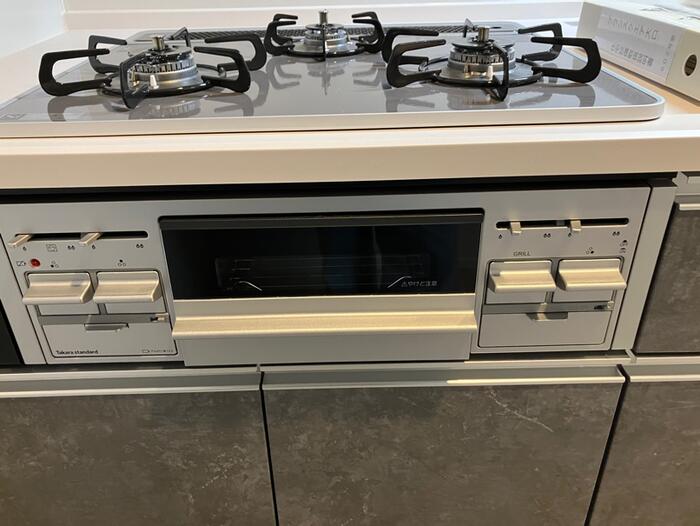 ガスコンロは3口で料理後の掃除がしやすいガラストップコート。ガスコンロの下で魚を焼いたりグリルもできます。