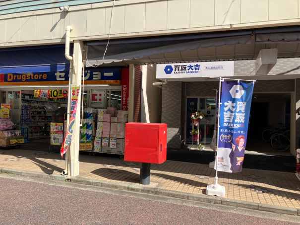 大口商店街入口 有名店つけ麺 キッチン高野 ココカラファイン横 ポスト前に買取大吉がオープンしたよいです