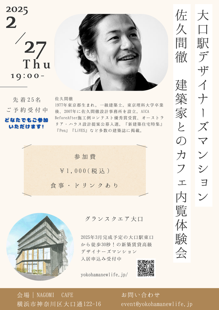 完成直前に、建築家からマンションの魅力・写真を使った内覧会をナゴミカフェで行います。